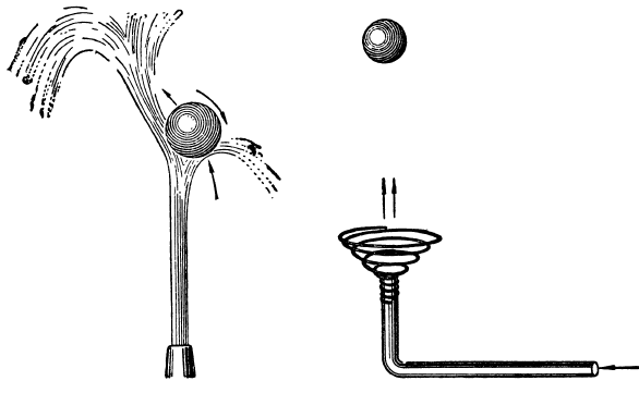 Шарик, танцующий в воздухе. Еще примерно за сто лет до нашей эры александрийский ученый Герон произвел интересный опыт. На открытый конец изогнутой трубки он положил легкий шарик и затем в трубку нагнетал воздух. Шарик, поднявшись над концом трубки, как бы плясал в воздушной струе, не отлетая в сторону.