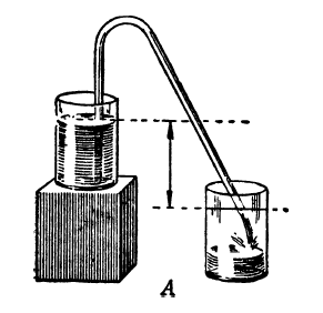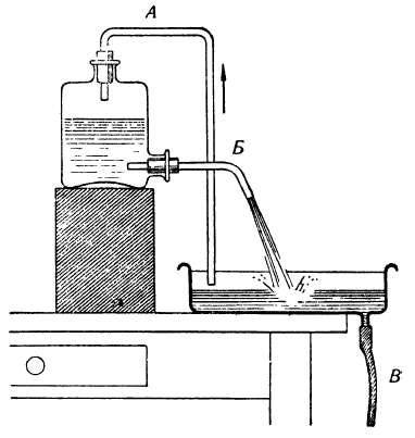 Короткий конец согнутой трубки вставляется в сосуд, откуда вытекает вода, а длинный – в пустую банку (рис. 22, А). Если предварительно набрать воду в трубку и опустить ее короткий конец в верхний сосуд с водой, то достаточно будет открыть нижнее отверстие для того, чтобы пошла непрерывная струя воды.