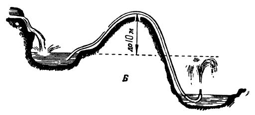 Опыт с сифоном очень хорошо произвести, воспользовавшись резиновой трубкой. Тогда можно наблюдать, что чем ниже опускать свободный конец трубки, тем быстрее будет выливаться вода, а если поднять конец трубки до уровня более короткой части сифона, вода совсем перестанет выливаться. Если же этот подвижной конец поднять вместе со вторым сосудом выше поверхности жидкости в верхнем сосуде, то вся вода из сифона выльется в верхний сосуд обратно. На рис. 22, Б показано, как можно провести воду из озера через горку и вывести ее в долину фонтаном.