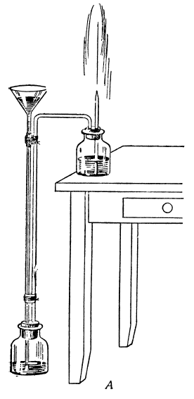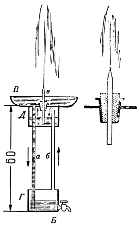 Возьмите две бутылки с широким горлышком, чтобы можно было вставить в них пробки с двумя стеклянными трубками (рис. 24, А). Одну из бутылок поставьте на стол и налейте в нее почти дополна воды. В пробку этой бутылки вставьте суженную наверху стеклянную трубку, нижний конец которой должен доходить почти до дна сосуда. Вторую трубку изогните в двух местах. Эта трубка должна быть такой длины, чтобы она доставала до второй бутылки.