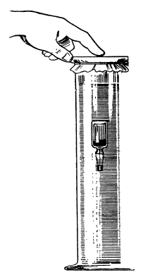 Когда отрегулируете плавучесть водолаза, накройте мензурку резиной, натяните ее и крепко привяжите. Теперь, как только вы нажмете пальцем на резину, водолаз пойдет ко дну Отпустите палец – и он сейчас же всплывет.