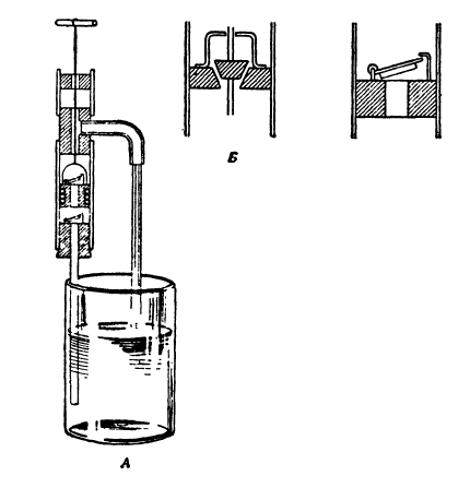 Для того чтобы поднять воду повыше, лучше всего пользоваться нагнетательным насосом. Устройство этого насоса показано на рис. 26, В. Разница в устройстве поршней только в том, что верхний клапан нагнетательного насоса сделан не в поршне, а в отливной трубке.