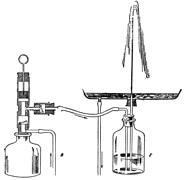 Чтобы получить равномерную струю воды, к насосу пристраивается воздушный резервуар. На нашем рисунке это бутыль Г. Отливная трубка продолжена почти до дна ее. Другая такая же трубка проходит сквозь горлышко этой бутыли наружу. Через отливную трубку насоса вода поступает в бутыль, а через вторую трубку вытекает из нее.