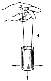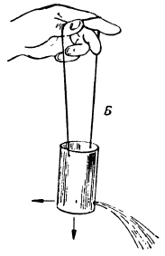 Повесьте на двух нитках высокую жестянку от консервов. Если концы нити привязаны точно по диаметру банки, то банка повиснет точно по отвесу (рис. 28, А). Вода не выводит ее из этого положения, потому что она равномерно давит на все стенки изнутри. Но если вы пробьете сбоку около дна маленькое отверстие и вода начнет выливаться, банка отклонится от вертикальной линии в сторону обратную струе воды (рис. 28, Б). Это происходит потому, что со стороны отверстия давление воды на стенку банки будет меньше, а на противоположной стороне оно останется прежним.