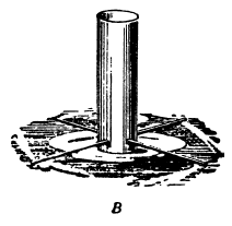 На этом принципе построено так называемое сегнерово колесо, представляющее собою вертушку, показанную на рис. 28, В. Вода выливается из четырех трубок, в которых с одной и той же боковой стороны пробиты отверстия, и обратное давление вращает всю вертушку.