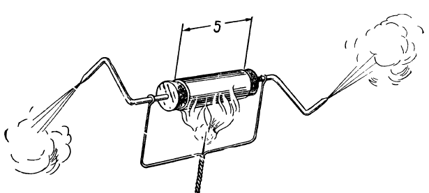 В толстую трубку налейте немного воды. На конец проволоки, выступающей в месте соединения П-образной рамки, поддерживающей эолипил, насадите кусочек ваты, смоченной спиртом. Зажгите спирт. Как только вода закипит, пар вырвется из отверстий трубок, и эолипил быстро завертится.