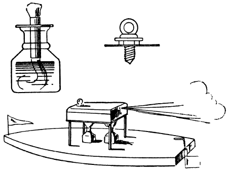 Налейте в котел на 2/3 воды, в склянки спирту и, когда фитили хорошо пропитаются спиртом, зажгите их. Как только вода в котле закипит, пар шипя станет вырываться из капсюля, и пароходик, важно пыхтя, поплывет вперед.
