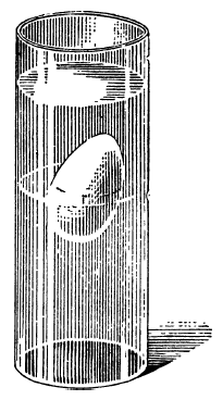 Потом, осторожно сливая по стенкам, долейте банку чистой водой. Теперь, если очень осторожно опустить в банку яйцо, оно потонет в верхней части и задержится во второй. Правда, сначала падающее яйцо по инерции опустится несколько ниже уровня соленой воды, но потом, немного поколебавшись вверх и вниз, оно остановится неподвижно на границе между двумя жидкостями (рис. 31).
