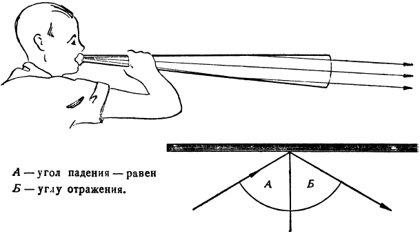 Сделайте, например, пометку мелом на стенке, на высоте вашего роста, прямо против себя, и с силой бросьте мячик в стену. Он вернется по тому же направлению, по которому был брошен. Если вы отойдете в сторону от пометки на стене и бросите в нее мячик, он отскочит в противоположную от вас сторону. Можно заранее сказать, в каком направлении он отскочит от стены. Если восставить перпендикуляр из точки удара мячика о стену и измерить угол, под которым мячик ударился, можно заметить, что он отскочил от стены под тем же углом к перпендикуляру. Первый угол называется углом падения, а второй – углом отражения. Поэтому физики говорят, что угол падения равен углу отражения (рис. 35, внизу). Этому же закону подчиняется и звук.