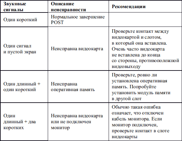 Если вы услышали последовательность коротких и длинных гудков, после чего компьютер прекратил работу, обратите внимание на количество и длительность этих гудков.[1] Подсчитав гудки, найдите данное сочетание звуковых сигналов в таблице, соответствующей BIOS вашего компьютера, чтобы определить, что означает данный сигнал. В табл. 1.1–1.3 приведены некоторые варианты звуковых сигналов, характерные для BIOS разных производителей, и краткие пояснения к ним.