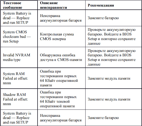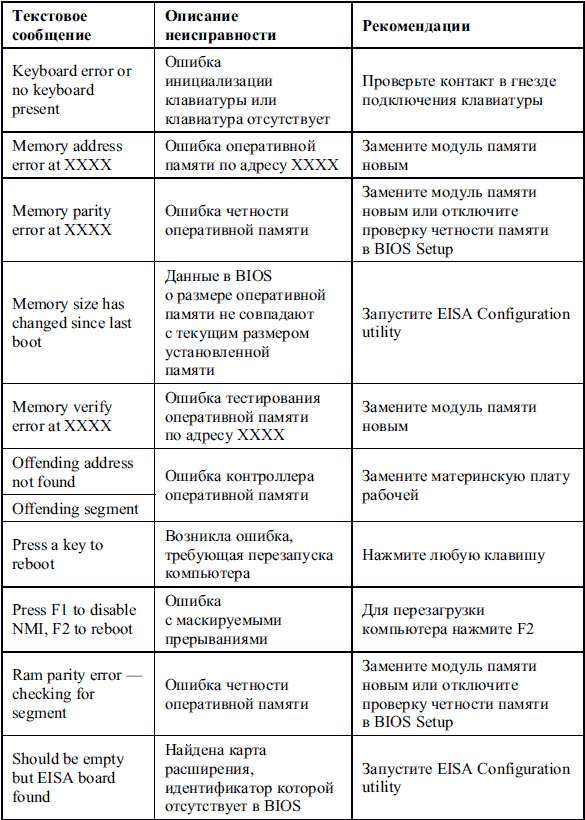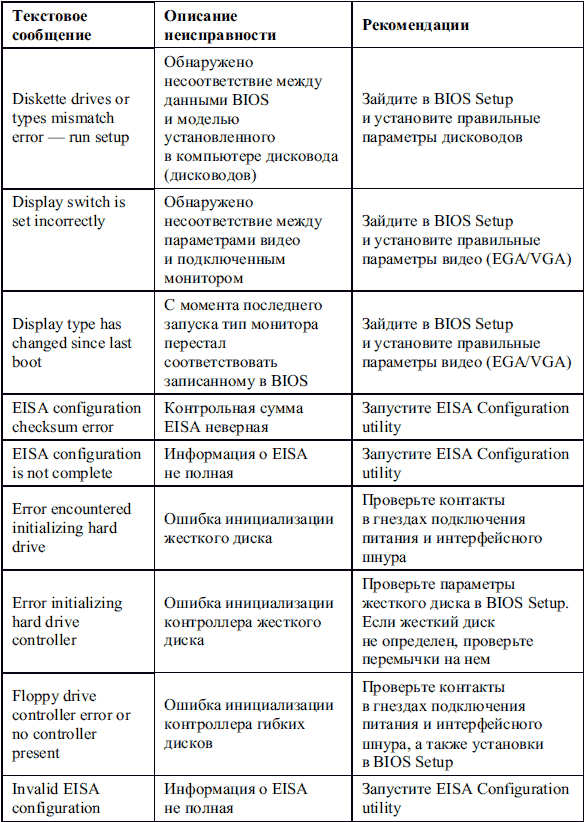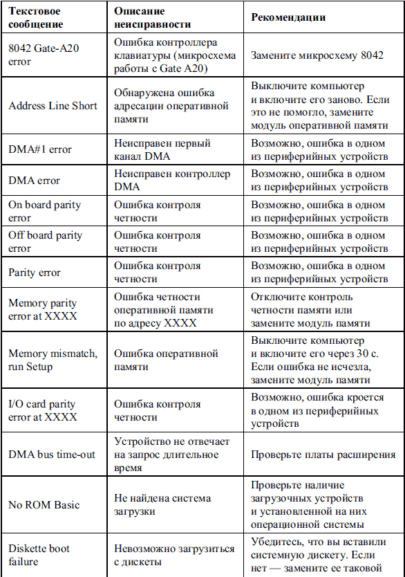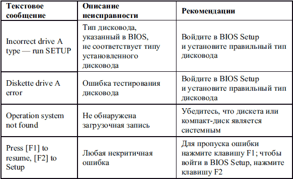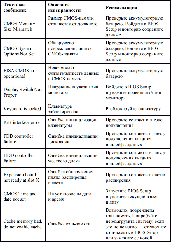 В табл. 1.4–1.6 приведены возможные варианты сообщений BIOS разных производителей.