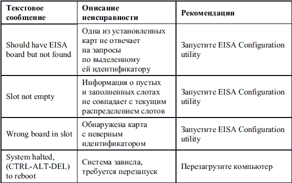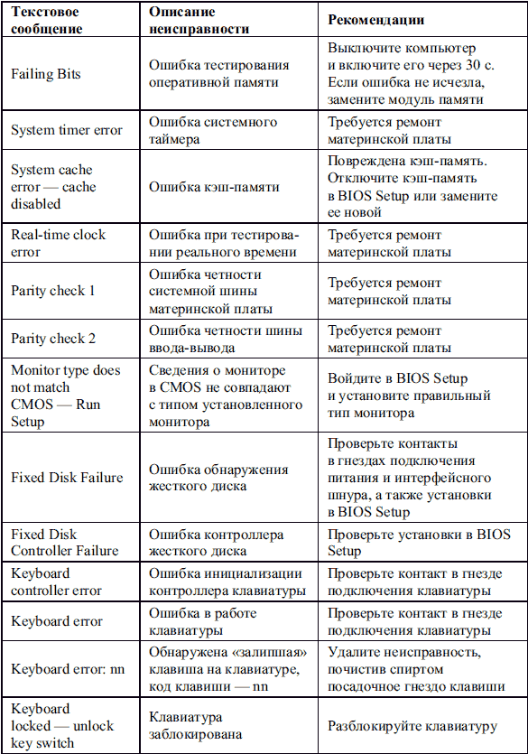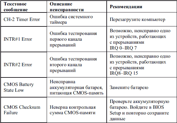 При обнаружении любой неисправности диагностическая программа выдаст специальный звуковой сигнал (последовательность коротких и длинных гудков), характеризующий обнаруженную ошибку, а компьютер прекратит свою работу до устранения неисправности.