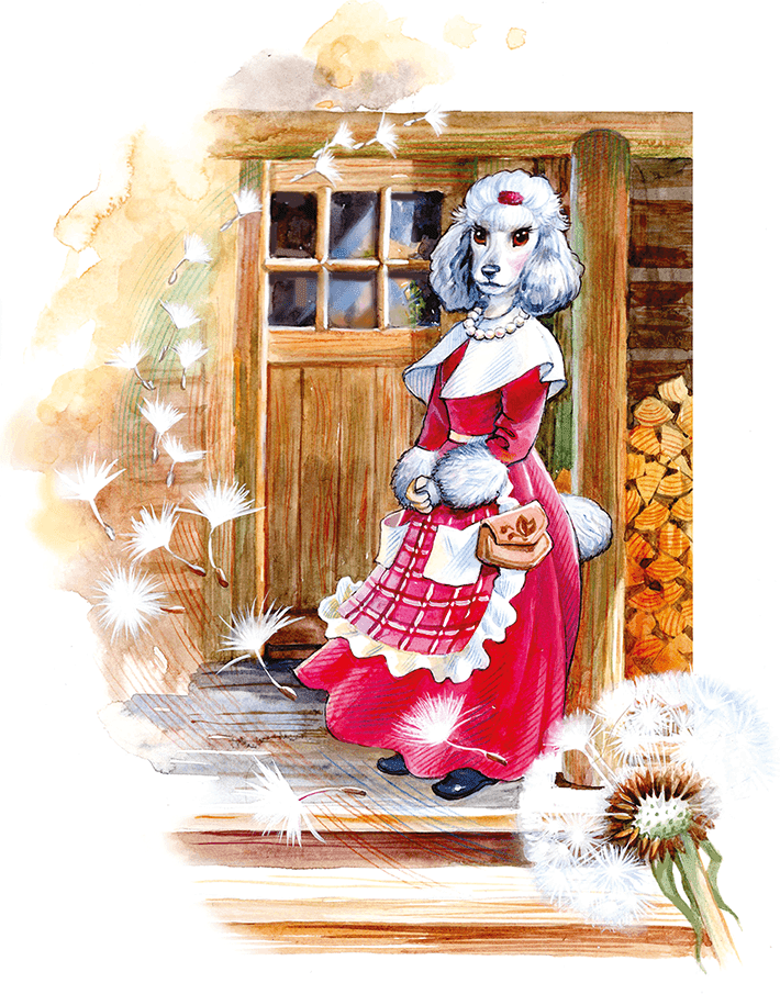 Послышался противный скрип, на пороге показалась стройная пуделиха, одетая в строгое темно-бордовое платье, которое очень хорошо смотрелось на ее серой шерстке. На талии у нее был повязан клетчатый фартук с оборками и большими карманами. Шею украшали жемчужные бусы.