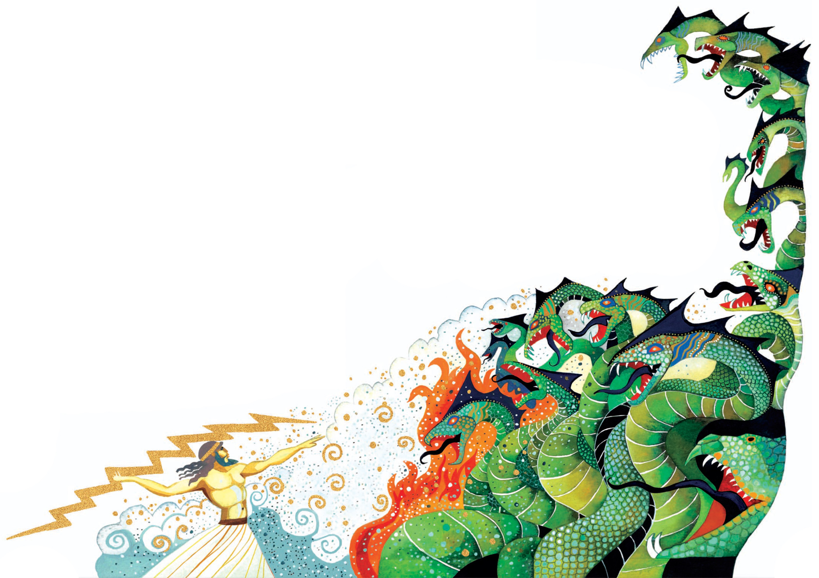Zeus had the Titans sealed in Tartarus with the hundred-handed ones as guards. Gaia was flummoxed. What was the point of locking away the Titans? Why did Zeus have to be as vengeful as his father? And so she gave birth to her last child, the monster Typhon. From his shoulders sprang a hundred serpentine heads with flickering black tongues uttering every noise imaginable—human, bestial, thunderous. Typhon’s eyes flashed fire. Everyone fell back in terror. Except Zeus. He had lightning, a force unsurpassed. He burned off Typhon’s heads and banished him to become wild winds that cursed sailors on the high seas. Zeus was the undisputed king.