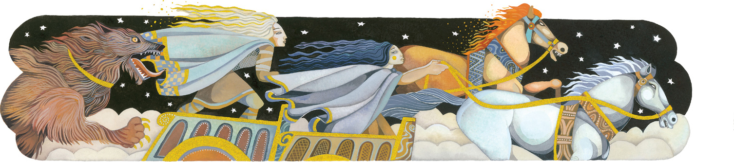 The giantess Night, of the blackest hair, and her son Day, of the blondest hair, rode chariots across the sky. Later their chariots would be guided by humans, and the savage wolf Skoll with his brother wolf would chase them.