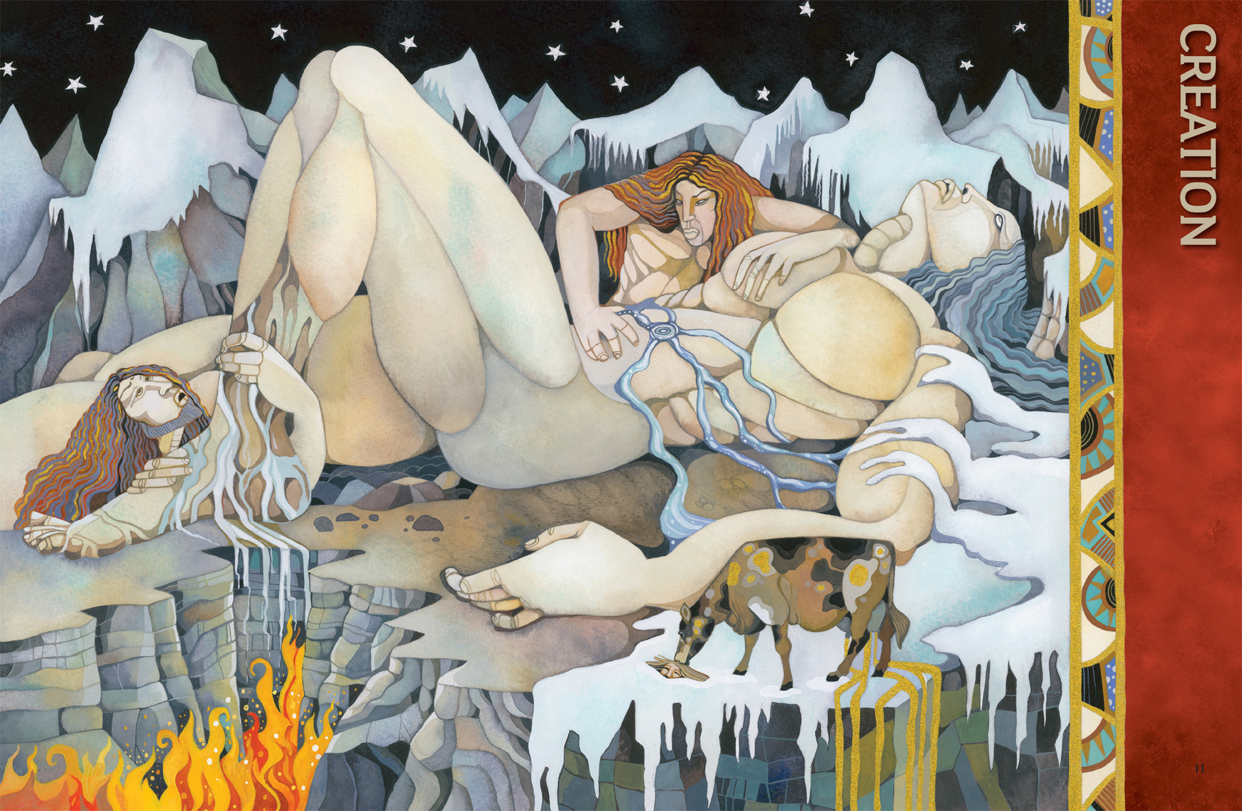 The frost giant Ymir emerged from the melting rivers of Ginnungagap. A daughter sprang from his sweaty armpit; a son, from his feet. The sweet-tempered cow Audhumla licked at the ice until she uncovered the head of the first god, Buri.