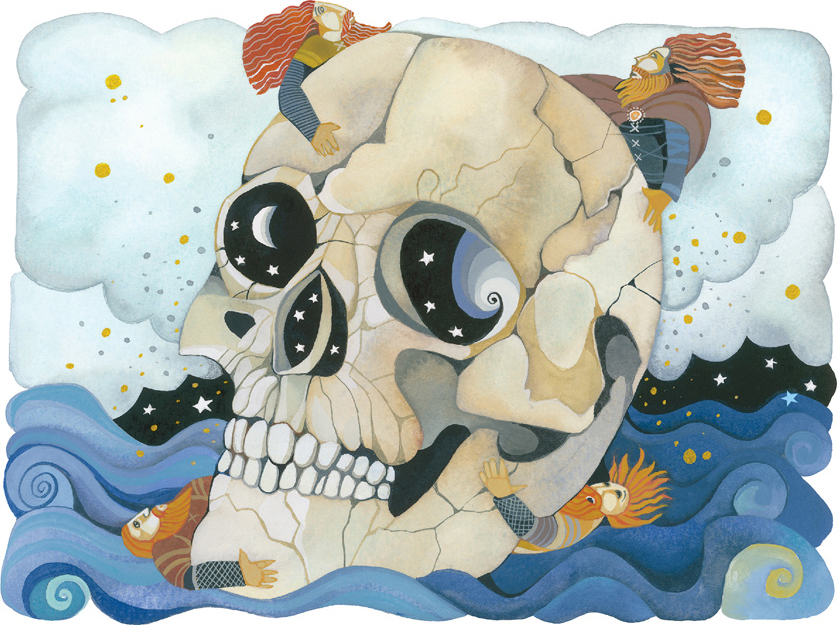 Ymir’s hollowed-out skull made the sky, and the three sons of Bor took the maggots crawling in Ymir’s rotted carcass and created small creatures called dwarfs. They set a dwarf under each of the four corners of this skull-sky to hold it up, arching over the earth. One dwarf was called Nordri—North; one, Austri—East; one, Sudri—South; one, Vestri—West. The other dwarfs ran off to live in the rocky caves. They became skilled craftsmen. It was they who wrought the decorative treasures of the gods.