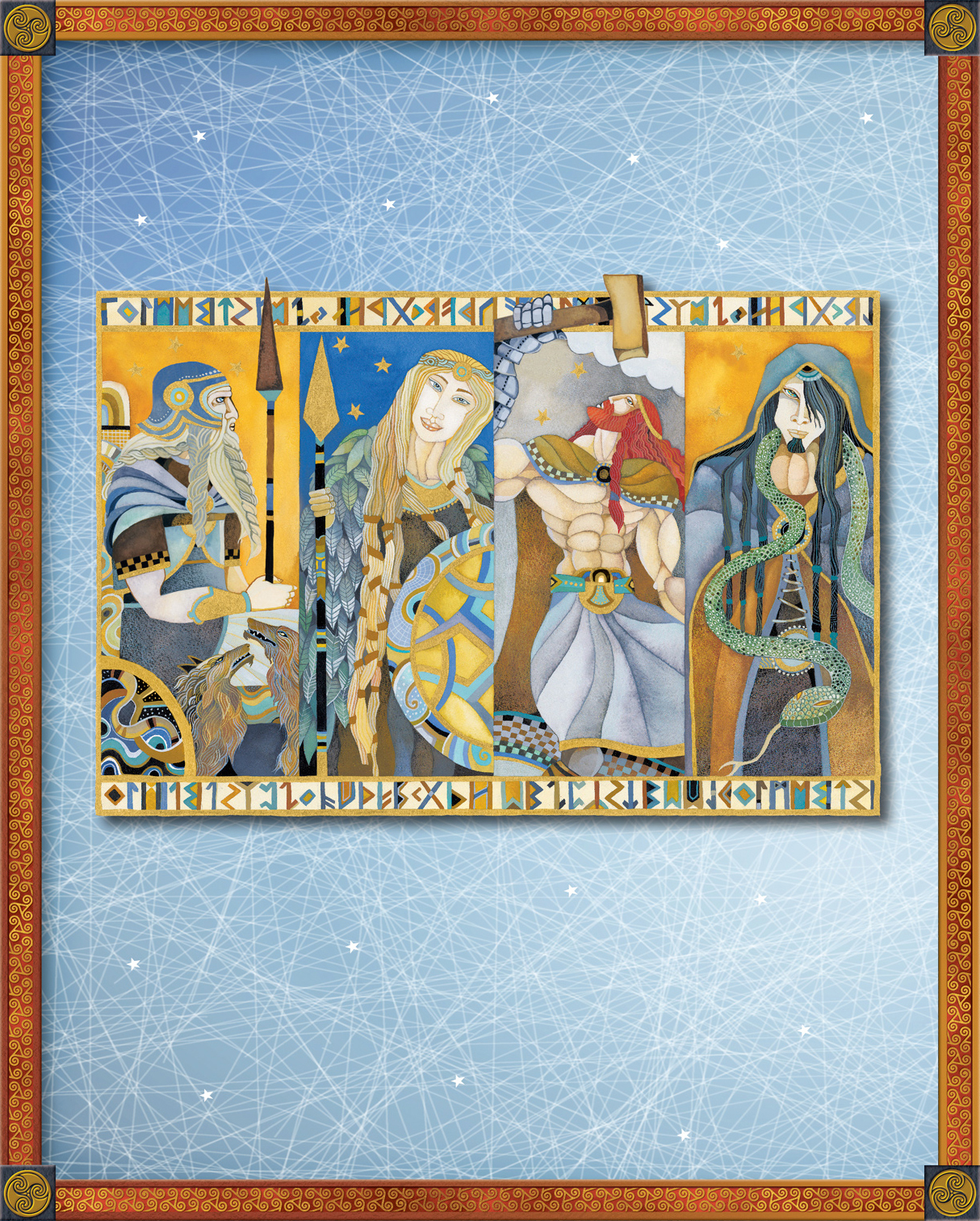 Cover: Four inhabitants of Asgard: Odin on his throne, two wolves at his feet; stunning Freyja in her falcon-feather coat; Thor with his hammer high, ready to bash enemies; and Loki lurking, envious and spiteful