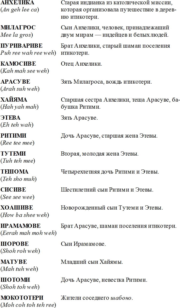Работая над этой книгой, я сделала в предварительных записях два изменения. Первое нужно было сделать с именами – название итикотери, так же как и имена всех описанных в книге людей, вымышленное. Второе изменение коснулось стиля. Для драматического эффекта я изменила последовательность событий, а для удобства чтения представила диалоги, используя свойственный английскому синтаксис и грамматические структуры. Разве можно было литературно перевести их язык, если я не способна даже достаточно компетентно судить о его сложности, гибкости и высокопоэтических метафорических выражениях. Многообразие суффиксов и префиксов придает языку яномама тончайшие оттенки значений, которые не имеют аналогов в английском языке.