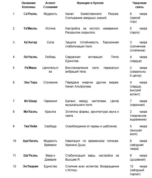 Каждая колонна – это не просто архитектурная опора. Это – космическая антенна, активатор, канал сознания, соединяющий небесные коды с человеческой сутью. Вместе они создают звездный круг Гармонии, удерживая структуру многомерного резонатора – Купола Созвучия.