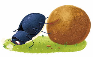 Вдруг видят: коренастый чёрный жук катит шарик. Да ещё и задом наперёд! Встал на передние лапы, как акробат, головой в землю упёрся, задние лапы вверх задрал и толкает ими шарик, пыхтит от усердия.