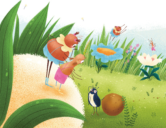 – Надо Жоре помочь, – говорит Шурочка Мурочке. – Посмотри, какие дружные муравьи, всё вместе делают. Надо нам ещё одного навозника найти и на помощь Жоре позвать. Вместе им легче будет шарик до норки докатить!