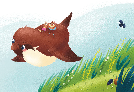 На следующее утро собрались все артисты во дворе. Очень хотелось им над блошками посмеяться. Но Шурочка с Мурочкой всех удивили: прилетели на скворце.