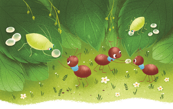 Видят, на дереве муравьи суетятся, тлей пасут. Тли выделяют сладкий сок, муравьи собирают эти капельки. А то, что собрать не успели, по листочку течёт, он становится липким. Из-за этого дерево и назвали липой. Присмотрелись блошки: муравьишка тлю пощекочет и сладкую капельку в рот кладёт, а потом бежит и другому муравью её передаёт.