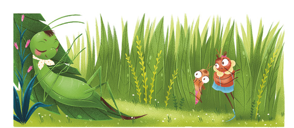В полдень блошки решили вздремнуть. Вдруг рядом зазвучала песня. Да так громко, что блошки проснулись. Осмотрелись Шурочка и Мурочка и увидели, что это кузнечик Динька крылышко о крылышко трёт, словно на скрипочке играет. Динька – знаменитый музыкант, всем его песенка нравится.