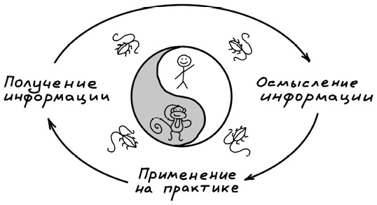 По какой-то причине в нашей культуре часто переоценивают знание – простое концептуальное знание, первый столп у буддистов. Как говорится, знание – сила. Однако буддисты, традиционно избегая абсолюта и крайностей, говорят о ситуациях, когда дисбаланс в составляющих обучения наносит человеку непоправимый вред. В статье одного из буддийских учителей [16] я натолкнулся на такой термин, как «невосприимчивость к Дхарме» (Дхармой с большой буквы в буддийской философии называют учение Будды). Им обозначается ситуация, когда человек, который слишком перестарался с получением информации (забыв о ее осмыслении и применении на практике), становится попросту невосприимчив ни к какому другому новому знанию. На входе в его сознание формируется фильтр: «Я это уже слышал или нет?» Если новая информация хоть как-то похожа на то, что человек уже знает, он пропускает ее мимо ушей. Когда получение знания не уравновешивается его осмыслением и применением на практике, наступает своего рода отравление знанием[8].