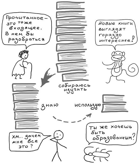 Относительно недавно я услышал интересную мысль: мы идем дальше и начинаем переоценивать уже не просто информацию, а сам факт обладания ею. «Я эту книгу уже купил» или «Я это уже скачал» местами воспринимается так же значимо, как и «Я это прочитал». А так как осмыслить проще, чем применить на практике, прочитать проще, чем осмыслить, а скачать проще, чем прочитать, мы нередко накачиваем себе на жесткие диски всякого и считаем себя ужас какими умными.