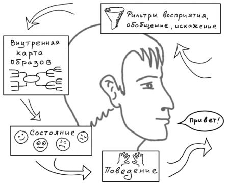 Такая же механика восприятия описана, скажем, в нейролингвистическом программировании. Процесс восприятия там называют моделированием, то есть созданием собственной модели реальности. Еще ее иногда называют картой и добавляют: «Карта местности – это не сама местность»[10]. А модель реальности – это не сама реальность. В НЛП выделяют три фундаментальных механизма моделирования: опущение, искажение и обобщение. Эти три механизма по-разному взаимодействуют с различной сенсорной информацией, которую получает наш ум, и создают в итоге именно модель реальности. Иными словами, картинку, в которой одни аспекты опускаются и искажаются, а другие, наоборот, обобщаются и выносятся на передний план. Вроде как наш ум строит модель реальности для того, чтобы мы лучше выполняли свои основные задачи. По умолчанию этими задачами являются выживание, а затем, кому повезет, размножение.