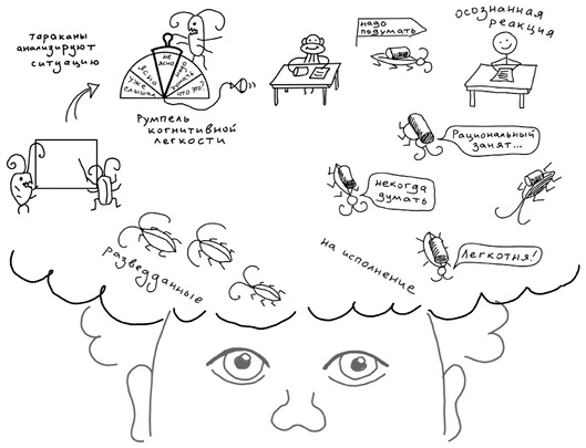 Получив разведданные из органов чувств, тараканы тащат их к себе в штаб. Там решается, что есть что из воспринятого, и на основании этого румпель когнитивной легкости переключается в нужное положение, определяющее, какая картинка пойдет обезьянке для принятия решения.