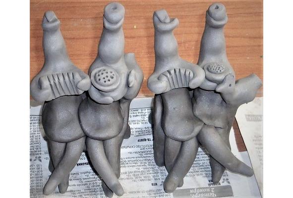 Будто тогда же бабы стали лепить из глины разнообразные свистульки на забаву детворе. Лепили в радость, вкладывая в каждую потешку столько душевного тепла, сколько хотели передать своему ребёнку. Из их рук появлялись на свет сказочные зверушки. Длинношеие «козлы», добрые «волки», забавные «коньки-горбунки». Лепили жеманных «барышень» с утками в руках, «кавалеров» с перьями в шляпах, лихих «всадников».