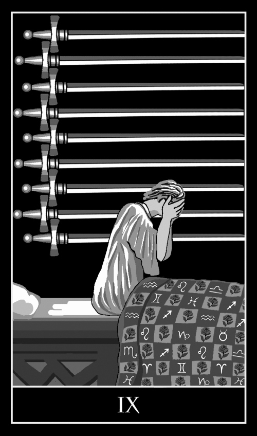какие чувства у вас вызывает данный Аркан? Какие детали первыми вы приметили? Какие детали карты стали заметны не сразу? Как вы считаете, о чем говорит Аркан Девятка Мечей?