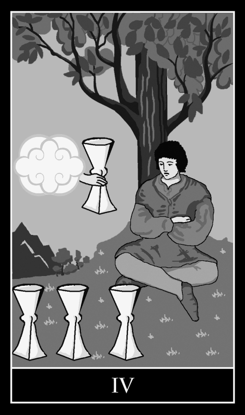 какие чувства у вас вызывает данный Аркан? Какие детали первыми вы приметили? Какие детали карты стали заметны не сразу? Как вы считаете, о чем говорит Аркан Четверка Кубков?