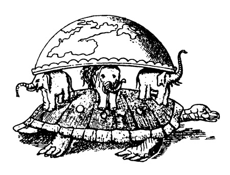 А вот более сложная картина. Земля – это полушарие, обращенное выпуклостью кверху. Полушарие лежит на спинах и поддерживается хоботами трех исполинских слонов, которые в свою очередь стоят на спине-панцире громадной черепахи. На что опирается черепаха? Этот вопрос оставался открытым. Одни говорили, что на какое-то твердое основание, другие – на воду. Ну, а на чем вода держится? И – начинай сначала…