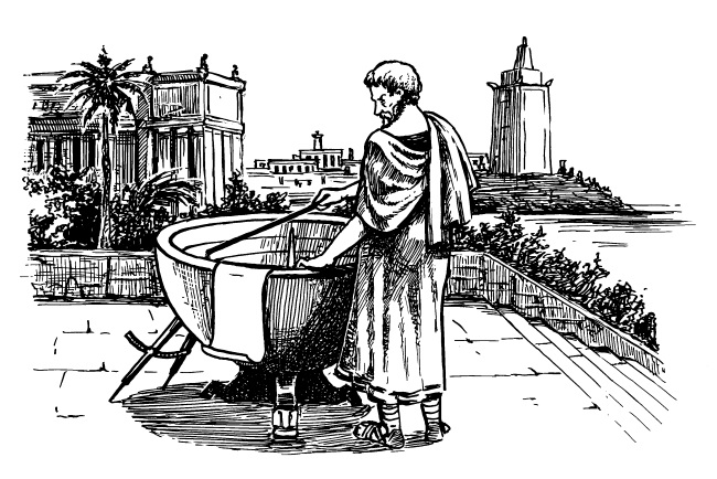 Кстати, об измерительных приборах. Для измерения зенитного расстояния Солнца Эратосфен использовал в качестве угломерного прибора солнечные часы – скафис. Основу прибора составляла чаша в форме полусферы, в центре которой установлен заостренный стержень. На внутренней поверхности чаши нанесены деления в виде горизонтальных окружностей. Отклонение тени в полдень самого долгого дня давало величину зенитного расстояния Солнца, а время определялось по отклонениям тени от направления «север – юг».