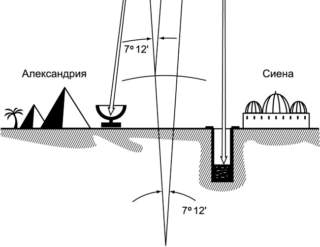 Это удалось сделать Эратосфену из Александрии, жившему в III в. до Р.Х. Александрия была тогда центром греческой науки и культуры в Египте. Этот город находится на одном меридиане с Сиеной (нынешний Асуан), отстоящей на 5000 египетских стадий (800 километров) к югу. Эратосфен обнаружил, что в Сиене в полдень самого длинного летнего дня Солнце освещает дно самых глубоких колодцев. Это значит, что солнечные лучи в этот час падают на Землю вертикально, то есть Солнце стоит в зените – высшей точке небосвода. В этот момент вертикально стоящие предметы не отбрасывают тени на поверхность Земли. А в Александрии в это же время Солнце отстоит от зенита на 7 градусов 12 минут, и на этот же угол отклоняется тень.