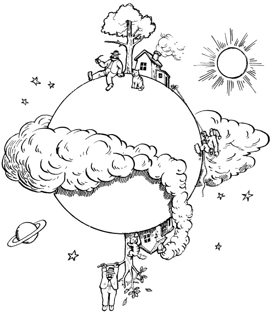 Когда вы впервые узнаете о том, что Земля имеет форму шара, и стараетесь осмыслить эту информацию, то у вас может возникнуть вопрос: «А почему люди на нижней стороне Земли не падают… на небо?» Это вполне нормальная реакция ребенка. А ведь бывало в старину, что иной взрослый человек, как, например, римский писатель Лактанций, всерьез возмущался: «Неужели найдется какой-нибудь взбалмошный мечтатель, который вообразит, что есть люди, ходящие вниз головой и вверх ногами?.. Что травы и деревья там растут, опускаясь вниз, и что дождь и град там падают снизу вверх?»