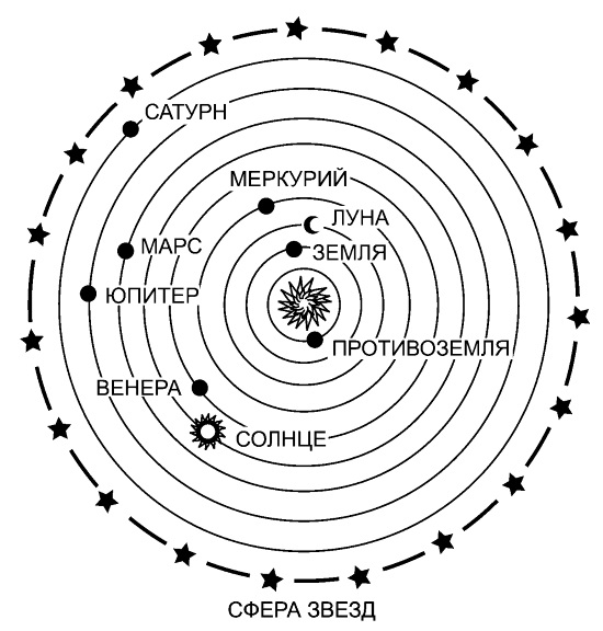 Интересно, что один из учеников Пифагора, Филолай, тогда еще предложил свой вариант строения Мира, отличающийся от гипотезы учителя. Он утверждал, что в центре всех сфер находится не Земля, а некий центральный огонь, который дает свет и тепло всем другим небесным телам. Земля, как и все планеты, вращается со своей сферой вокруг этого огня. К известным тогда планетам Филолай добавил еще и «противоземлю», которая находилась на своей сфере ближе всех к центральному огню, но всегда напротив Земли и поэтому не видна. Солнце тоже вращается вокруг огня, но в отличие от планет своей гладкой блестящей поверхностью отражает его свет, передавая планетам. Система Филолая не нашла признания ученых коллег. А ведь он был ближе к истине, несмотря даже на этот странный «центральный огонь» вместо Солнца…