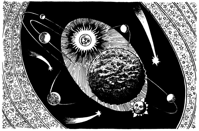 Именно так, в частности, устроена наша Вселенная по представлениям пифагорейской школы. В самом центре Вселенной – неподвижная Земля. Земля, по мнению Пифагора, висит во Вселенной без всякой поддержки. Вокруг Земли вращаются, одна внутри другой, девять сфер. Это сферы Луны, Солнца и пяти планет – Меркурия, Венеры, Марса, Юпитера и Сатурна. Дальше всех расположена звездная сфера. Это была очень красивая картина Мира и Порядка – одним словом, Космос.