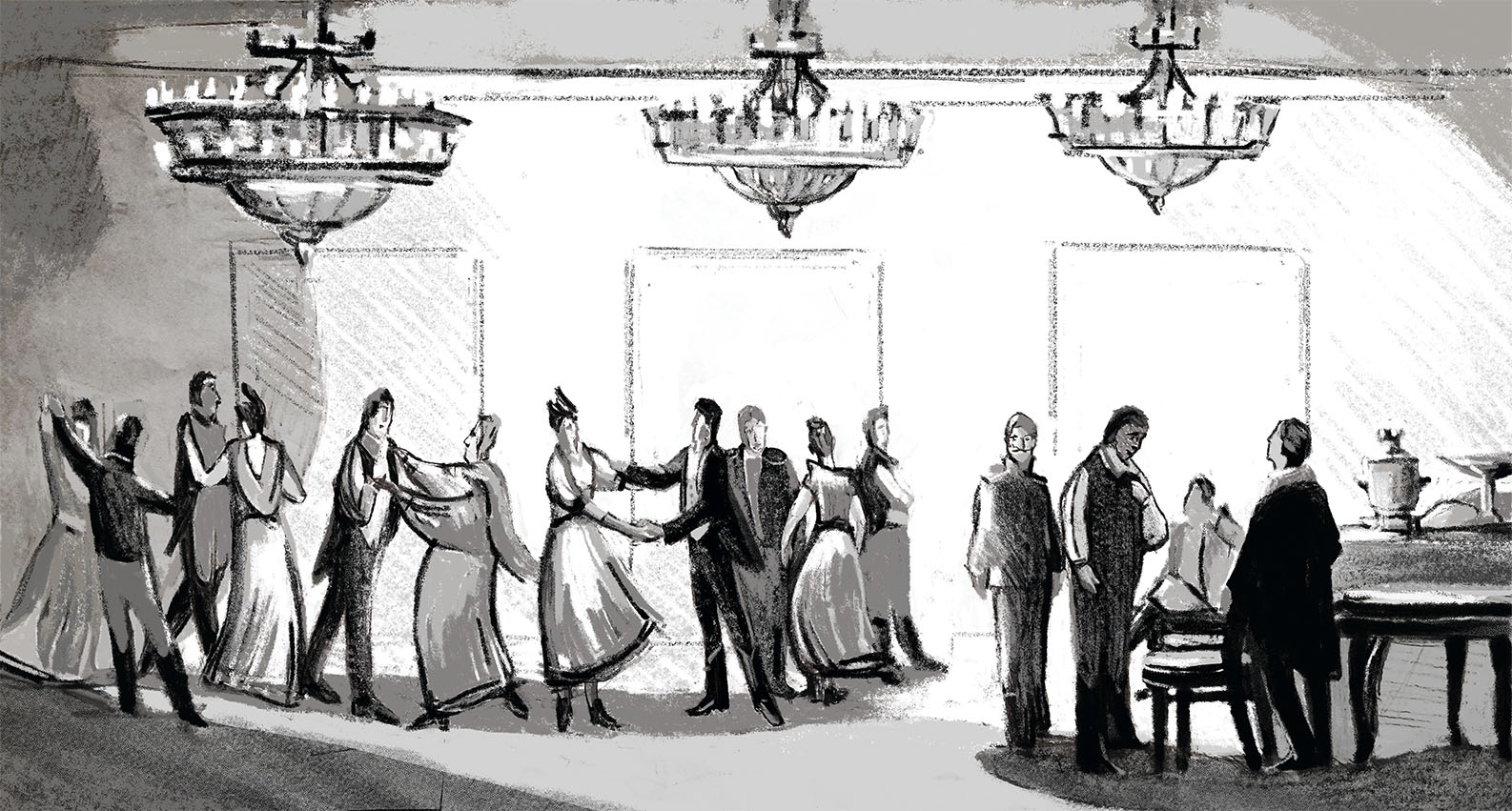 Минута была торжественная. Господин Голядкин чувствовал, что эффект был вернейший. Господин Голядкин стоял, скромно потупив глаза и ожидая объятий Олсуфия Ивановича. В гостях заметно было волнение и недоумение; даже сам непоколебимый и ужасный Герасимыч заикнулся на слове «сумнительно-с»… как вдруг беспощадный оркестр ни с того ни с сего грянул польку. Всё пропало, всё на ветер пошло. Господин Голядкин вздрогнул, Герасимыч отшатнулся назад, всё, что ни было в зале, заволновалось, как море, и Владимир Семёнович уже нёсся в первой паре с Кларой Олсуфьевной, а красивый поручик с княжной Чевчехановой. Зрители с любопытством и восторгом теснились взглянуть на танцующих польку – танец интересный, новый, модный, круживший всем головы. Господин Голядкин был на время забыт. Но вдруг всё заволновалось, замешалось, засуетилось; музыка умолкла… случилось странное происшествие. Утомлённая танцем, Клара Олсуфьевна, едва переводя дух от усталости, с пылающими щеками и глубоко волнующеюся грудью упала, наконец, в изнеможении сил в кресла. Все сердца устремились к прелестной очаровательнице, все спешили наперерыв приветствовать её и благодарить за оказанное удовольствие, – вдруг перед нею очутился господин Голядкин. Господин Голядкин был бледен, крайне расстроен; казалось, он тоже был в каком-то изнеможении, он едва двигался. Он отчего-то улыбался, он просительно протягивал руку. Клара Олсуфьевна в изумлении не успела отдёрнуть руки своей и машинально встала на приглашение господина Голядкина. Господин Голядкин покачнулся вперёд, сперва один раз, потом другой, потом поднял ножку, потом как-то пришаркнул, потом как-то притопнул, потом споткнулся… он тоже хотел танцевать с Кларой Олсуфьевной. Клара Олсуфьевна вскрикнула; все бросились освобождать её руку из руки господина Голядкина, и разом герой наш был оттеснён толпою едва ли не на десять шагов расстояния. Вокруг него сгруппировался тоже кружок. Послышался визг и крик двух старух, которых господин Голядкин едва не опрокинул в ретираде. Смятение было ужасное; всё спрашивало, всё кричало, всё рассуждало. Оркестр умолк. Герой наш вертелся в кружке своём и машинально, отчасти улыбаясь, что-то бормотал про себя, что, «дескать, отчего ж и нет, и что, дескать, полька, сколько ему по крайней мере кажется, танец новый и весьма интересный, созданный для утешения дам… но что если так дело пошло, то он, пожалуй, готов согласиться». Но согласия господина Голядкина, кажется, никто и не спрашивал. Герой наш почувствовал, что вдруг чья-то рука упала на его руку, что другая рука немного оперлась на спину его, что его с какою-то особенною заботливостью направляют в какую-то сторону. Наконец он заметил, что идёт прямо к дверям.
