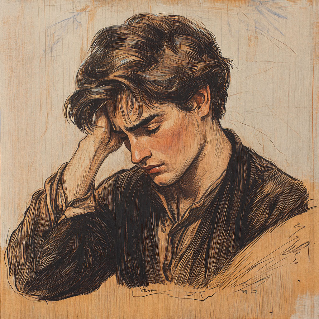 Все тело его было как бы разбито; смутно и темно на душе. Он положил локти на колена и подпер обеими руками голову.