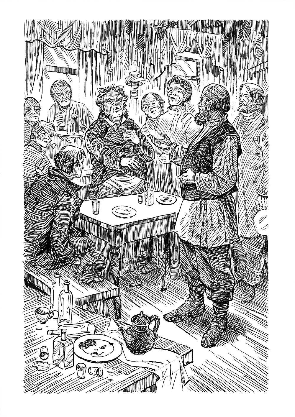 И он опустился на лавку, истощенный и обессиленный, ни на кого не смотря, как бы забыв окружающее и глубоко задумавшись. Слова его произвели некоторое впечатление; на минуту воцарилось молчание, но вскоре раздались прежний смех и ругательства: