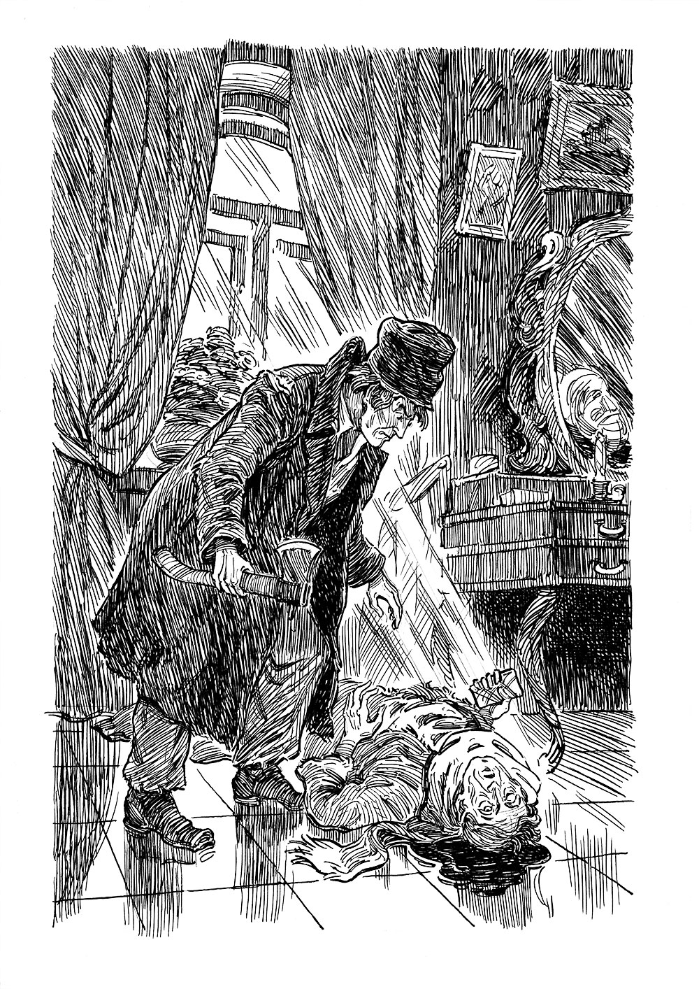 Старуха, как и всегда, была простоволосая. Светлые с проседью, жиденькие волосы ее, по обыкновению жирно смазанные маслом, были заплетены в крысиную косичку и подобраны под осколок роговой гребенки, торчавшей на ее затылке. Удар пришелся в самое темя, чему способствовал ее малый рост. Она вскрикнула, но очень слабо, и вдруг вся осела к полу, хотя и успела еще поднять обе руки к голове. В одной руке еще продолжала держать «заклад». Тут он изо всей силы ударил раз и другой, всё обухом и всё по темени. Кровь хлынула, как из опрокинутого стакана, и тело повалилось навзничь. Он отступил, дал упасть и тотчас же нагнулся к ее лицу; она была уже мертвая. Глаза были вытаращены, как будто хотели выпрыгнуть, а лоб и всё лицо были сморщены и искажены судорогой.