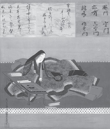 Мурасаки Сикибу. Художник Тоса Мицуоки, XVII век. Придворные дамы эпохи Хэйан носили многослойные кимоно, а волосы у них были настолько длинные, что ниспадали до пола