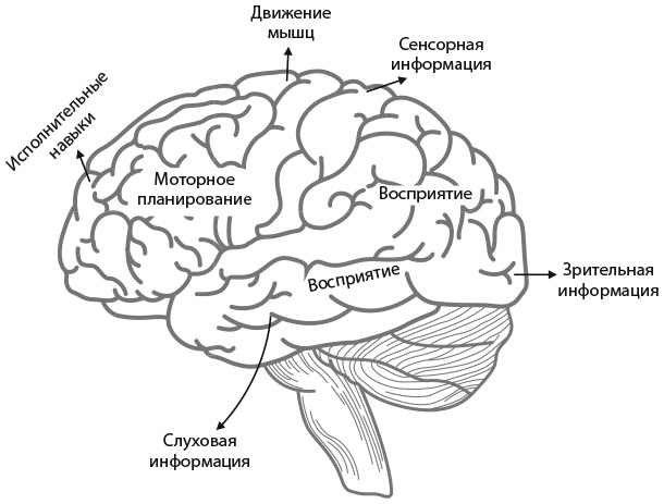Как выяснили ученые, этот скачок локализуется главным образом в лобных долях, – важная информация в контексте нашей книги. В настоящее время исследователи сходятся в том, что лобные доли мозга играют ключевую, хотя и не исключительную роль в развитии исполнительных навыков. Таким образом, мы можем с уверенностью сказать, что эти области, особенно префронтальная кора, а также их связи с соседними отделами в значительной степени составляют фундамент для исполнительных навыков. Что же касается бурного наращивания нейронных связей в раннем подростковом возрасте, то это похоже на самоподготовку головного мозга к будущим вызовам, отвечать на которые придется с помощью исполнительных навыков. На рисунке 1.1 показано, за какие функции условно отвечают разные области мозга[6], включая и исполнительные навыки (локализация в префронтальной коре).