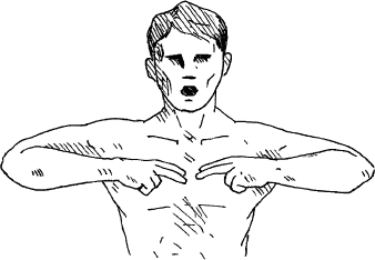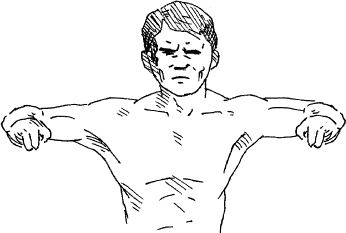 Располагаем руки, согнутые в локтевом суставе, перед грудью (рис. 1). Пальцы сложены, как описано выше. Вытянутые пальцы каждой руки направлены друг к другу. Если опасаетесь, что ударите своего соседа, просто встаньте через одного, упражнение можно выполнять и стоя! Задача очень сложная – на вдохе нужно располагать руки с вытянутыми пальцами друг к другу, а на выдохе – отводить от себя. Вытянутые пальцы при этом будут выставлены вперед (рис. 2). Плечо зафиксировано, движение происходит только в локтевом суставе! По опыту знаю, сколько ни показывай, непременно половина студентов сделают неправильно, поэтому я рассчитываю на ваш интеллект!