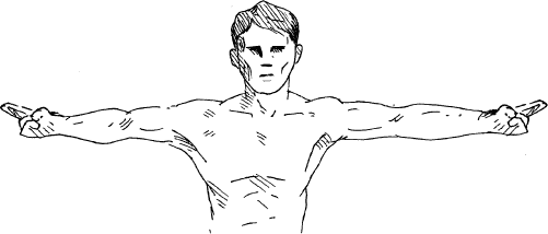 Теперь те, кто стоит, должны сделать небольшой поворот по часовой стрелке на тридцать градусов, – деловито продолжал Наставник. – Почему? Потому что нужно поменять положение пальцев, теперь большой палец накрывает безымянный и мизинец, а не находится под ними, как это было в предыдущих упражнениях. Расставили руки в стороны, так чтобы ладони смотрели в потолок и подлокотные ямки тоже, словно вас растянули за пальчики в стороны… (рис. 4). И в таком положении стоим три минуты! А я расскажу вам, зачем мы это делаем, ибо ничто так не успокаивает, как знание «зачем», – усмехнулся он.